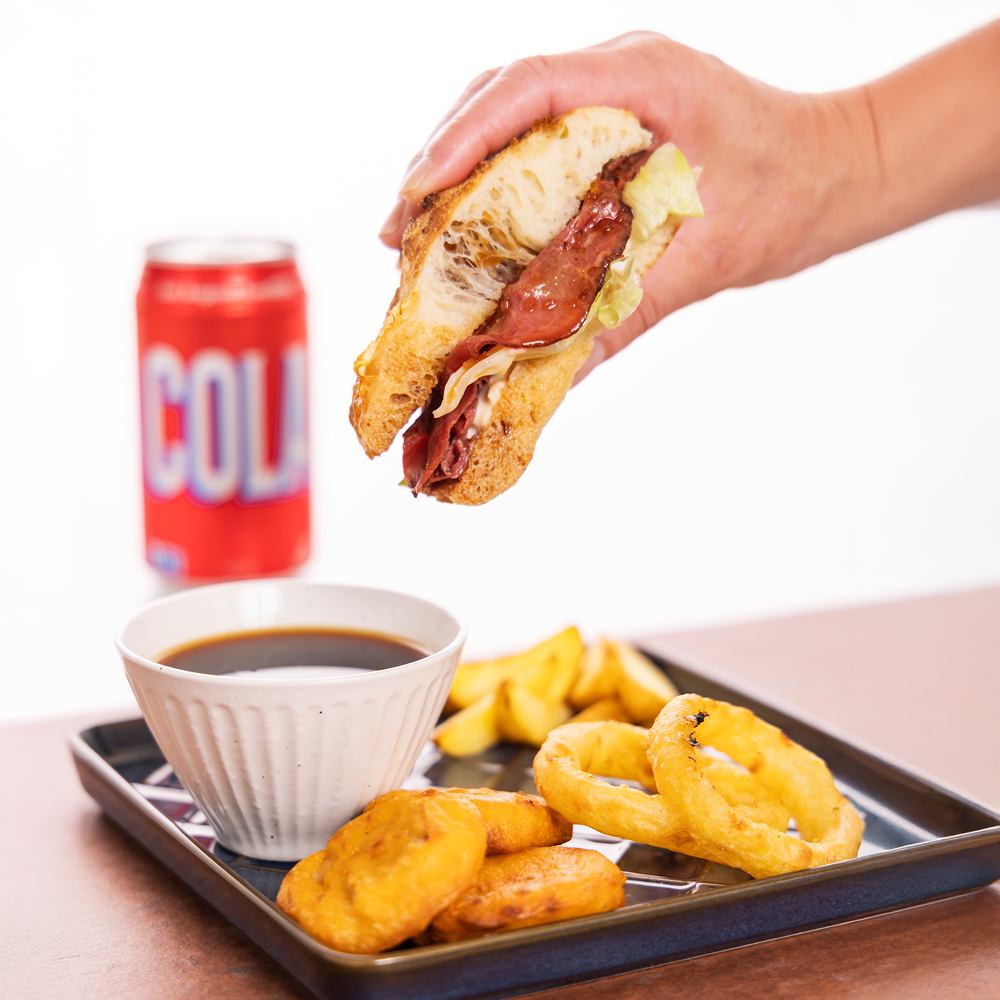 ロサンゼルスで流行っているフレンチディップサンド!スープに浸して食べるスタイル!特製グレイビーソースにたっぷりつけてお召し上がりください。※こちらの商品はポテト、ナゲット、オニオンリングがついたセットの商品になります。